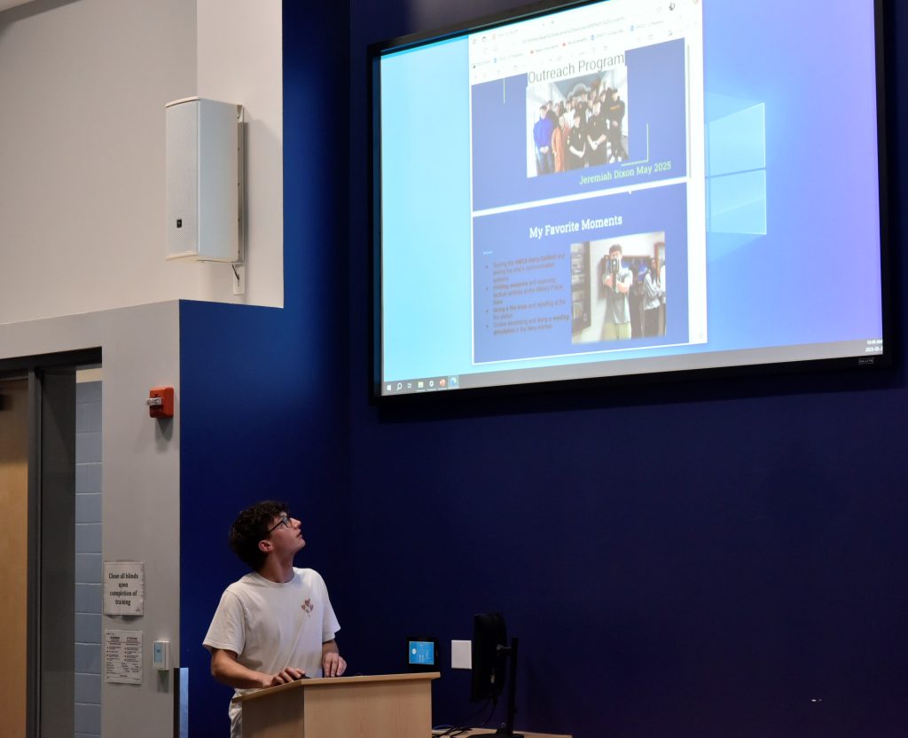 During the final week of the program, the students toured Naval Fleet School (Atlantic)’s small arms trainer in building S120 then gathered in the facility’s auditorium to deliver their final presentations and feedback about the program to their peers, teachers, program organizers, and the Base Commander and Base Chief.