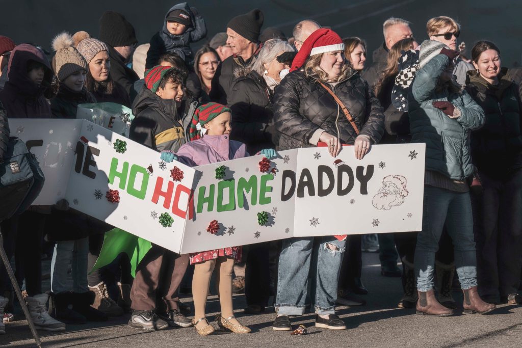 Des spectateurs portant de vêtements festifs et brandissant des pancartes sur le thème des Fêtes ont acclamé le vaisseau lorsqu’il est venu s’amarrer à l’Arsenal canadien de Sa Majesté. L’atmosphère de célébration était rehaussée par de la musique en direct interprétée par des membres de la Musique Stadacona. Le St. John’s est revenu d’un déploiement de cinq mois dans le cadre de l’opération REASSURANCE, à l’appui des efforts de défense et de dissuasion de l’OTAN en Europe.